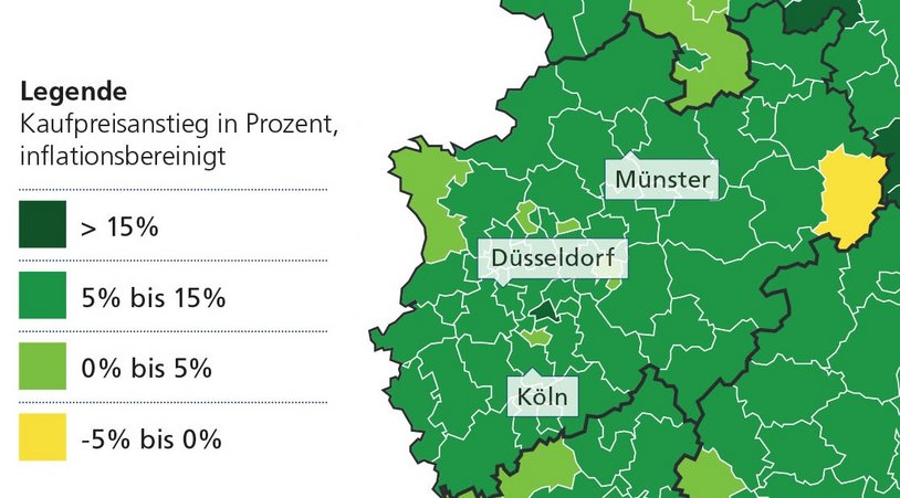 Der Anstieg der Immobilienkaufpreise in NRW in Prozent, inflationsbereinigt (Quelle: Postbank Wohnatlas 2019).